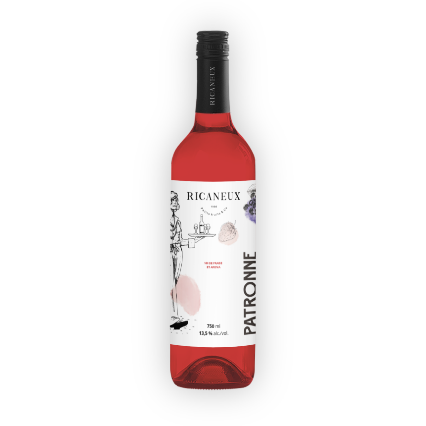 Chaleureuse et passionnée, la Patronne sait néanmoins se montrer sèche quand quelque-chose ne fait pas son affaire. C’est un peu ce que l’on retrouve dans ce vin qui combine la douceur caramélisée de la fraise avec les tannins de l’aronia. Un mariage entre la fraise, fruit cultivé dans Bellechasse de longue date et l'aronia ou gueule noire, fruit indigène présent dans les milieux acides et les tourbières.